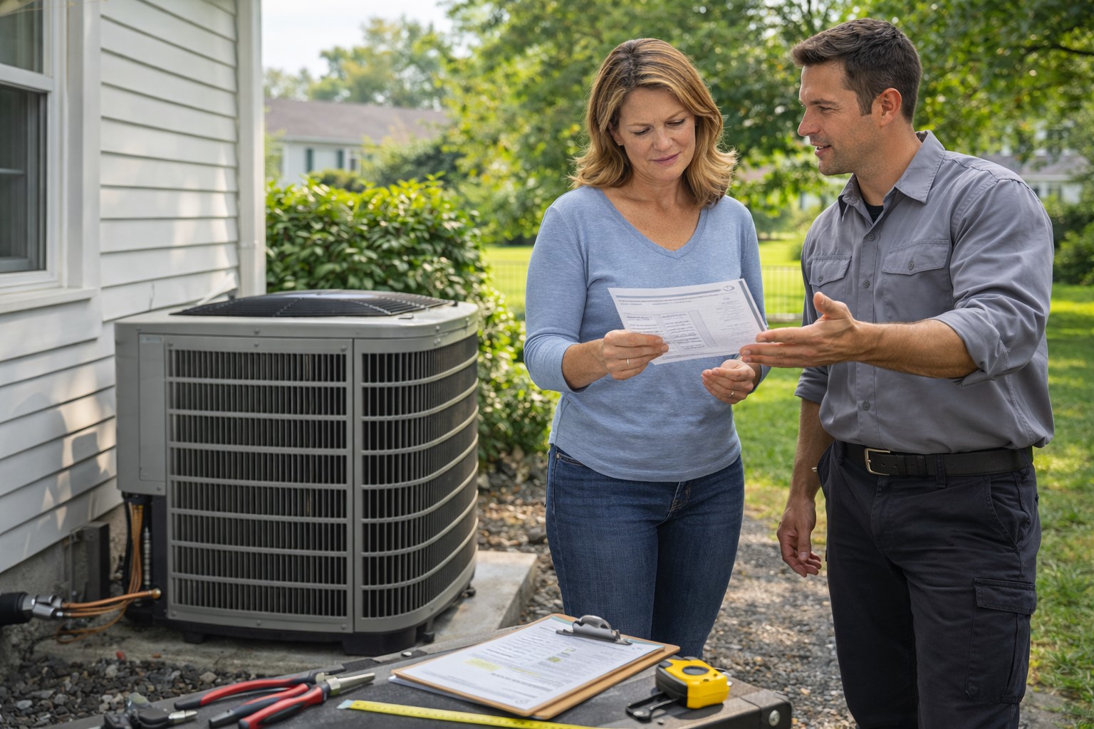 Homeowner and HVAC technician reviewing installation estimate beside new AC unit in Simsbury.